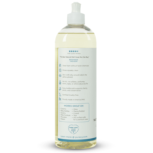 Puracy Natural Dish Soap is a sulfate-free, grease-cutting, skin-nourishing cleanser made from plants, minerals, water, and a hint of green tea & lime. The biodegradable ingredients were carefully chosen and developed into a premium solution by Puracy, a trusted source for all natural, plant-based, child & pet safe, hypoallergenic, and effective household essentials. The proprietary blend of renewable ingredients is safe to use around your family and free from harsh chemicals and fumes. The concentrated formula requires only a teaspoon to do a sink full of dishes. Our dish soap is tough enough for pots and pans, gentle enough for natural wood cutting boards, and pure enough to wash your hands with.