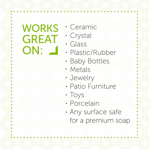 - Plant-powered, baby-safe formula works great on ceramic, crystal, glass, plastic, baby bottles, porcelain, metals, jewelry, patio furniture, toys, rubber, and any other surface that is safe for a premium soap