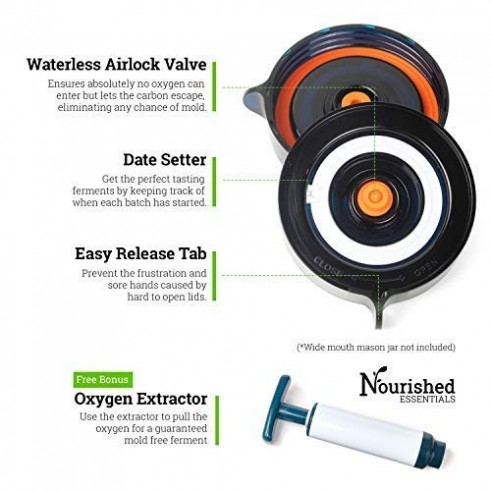The "Easy Fermenter" lids let gas escape, but keep mold and bacteria out. You’ll never have to burp your jars or deal with messy water airlocks. The built in date dial means you’ll always get the timing right, and the pull tabs help you open the jar. It’s so simple.